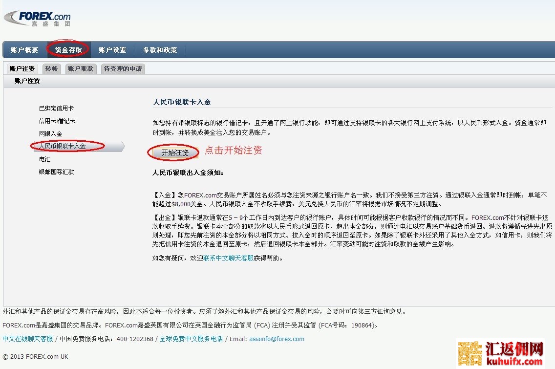 注意: ● 嘉盛账户所属姓名必须与开通网银的银行账户名一致。 ● 嘉盛平台不接受第三方注资。通过银联入金通常即时到帐,单笔入金不超过$8,000美金。 ● 人民币银联入金嘉盛是不收取手续费,美元兑换人民币的汇率将根据市场情况调整。 ------------------------------------------------------------------ 以下是嘉盛平台银联入金图文介绍。 1,选择菜单的资金存取,左边菜单的人民币银联入金,点击开始注资。
