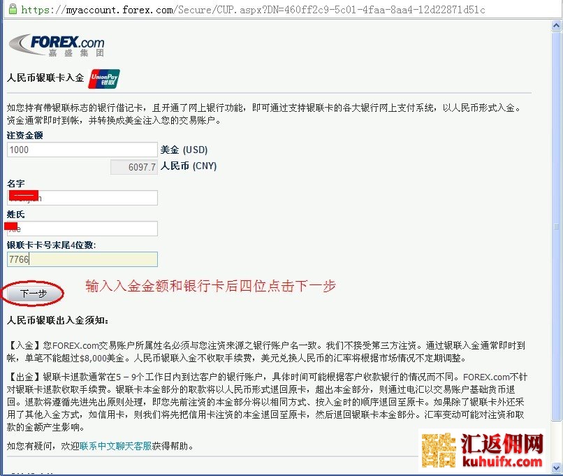 2,填写注资金额,姓名,银联卡卡号末尾数4位数,点击下一步。