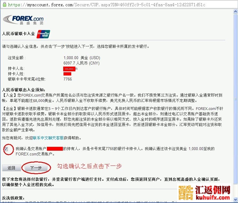 3,再次确认入金信息,勾选确认之后点击下一步。