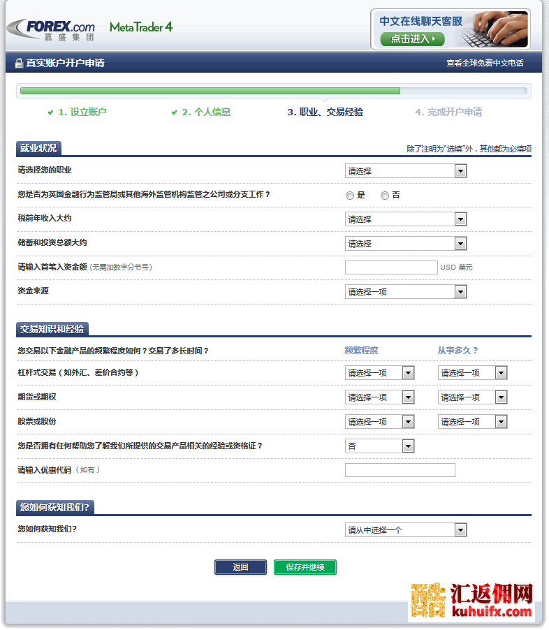 第三步:然后是填写“职业,交易经验”这个选项主要是嘉盛用来评估客户资金的,按照实际情况填写即可,如果没有合适您的选项,可以选择适当接近的选项。
