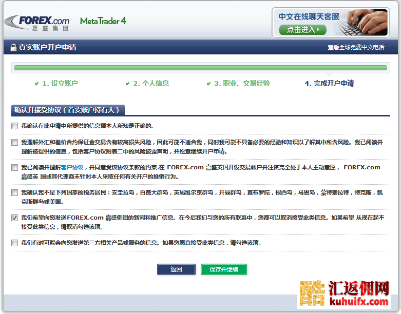 第四步:第四步就是协议同意界面,将他列举出来的选项打勾即可,最后一条是嘉盛会给你邮箱发布他们的公司信息,如果你不愿意接受的话,这个选项可以不勾选。
