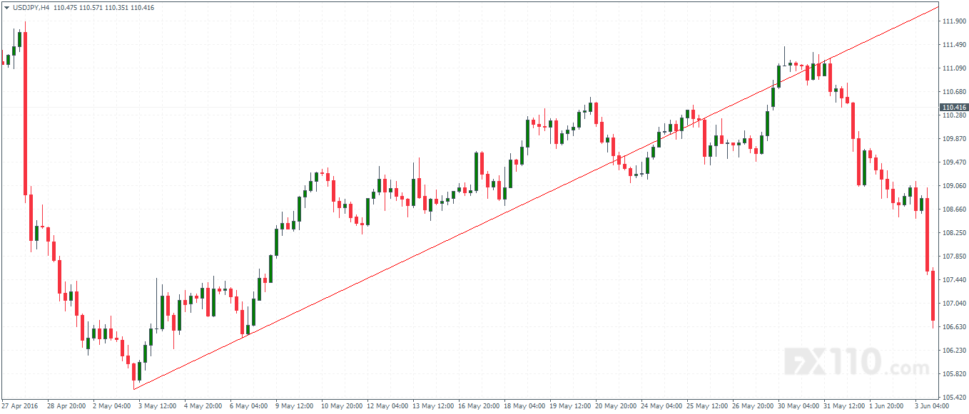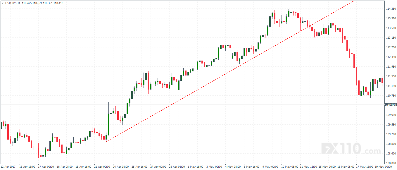 突破交易方法面临的最常见问题之一是假突破。 当市场价格诱骗你进入一个虚假突破,只是为了让你入场交易,并(通常)在相反的方向以新的势头移动,假突破就产生了。不只是水平突破或蜡烛图突破,即便是趋势线,这种情况也经常发生。 要想减少被假突破套牢的几率,第一步是绘制趋势线。一旦你绘制了趋势线,就知道当价格突破(上涨或下跌)趋势线时,该做多还是做空。 下图可以说明这一点。  图1:美元兑日元上升趋势线突破 在图1中,上升趋势线有一个经典突破。这很简单,你在突破线以上做空,幸运的是,价格没有走高。接下来,看下一个图表的趋势线突破会发生什么。