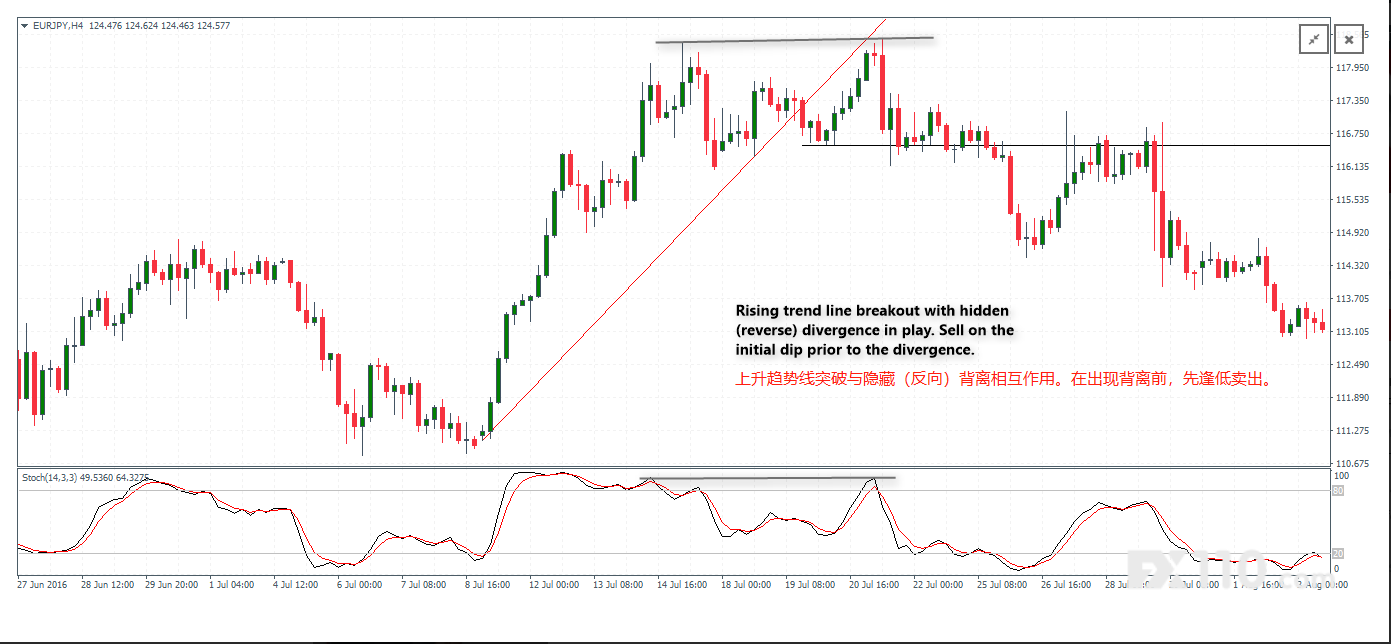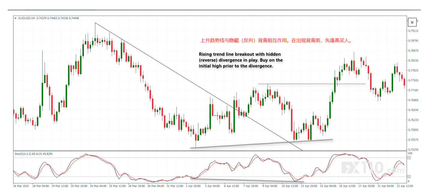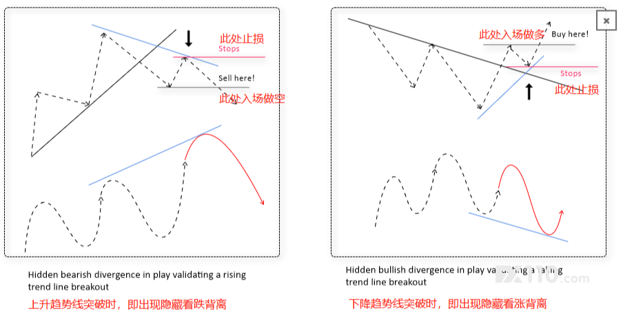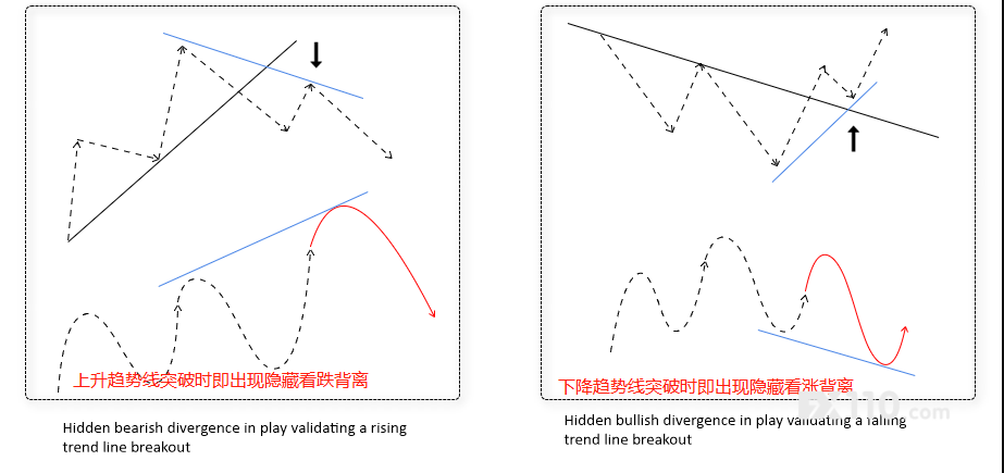 使用背离法是避免假突破的一种简单但有效的方法。通过使用这种方法,交易员只能寻找合格的突破。与普通背离法相比,隐藏背离(或反向背离)可能有点复杂,但操作起来其实很简单。 如果价格出现较低高点,而振荡指标(MACD或随机指标或RSI)出现较高的高点时,则出现隐藏看跌背离。 趋势交易:随机指标& MACD指标策略 如果价格出现较高的低点,而震荡指标出现较低的低点时,则出现隐藏看涨背离。 当用于趋势线时,交易者很容易找到这种设置。因此,当趋势线上升时,我们寻找通过趋势线突破确认的空头头寸,以及由隐藏看跌背离确认的突破回调。 当趋势线下降时,我们寻找价格的第一个突破,然后回调形成一个较高的低点位置。则为隐藏看涨背离。 在这两种情况中,价格都有一个较低的高点和一个较高的低点,止损可以设置在较近的高点或低点。 如果以上说明看起来很复杂,请看下图,它解释了这个概念。  图3:隐藏背离可以判断趋势线突破 什么时候开始入场交易?