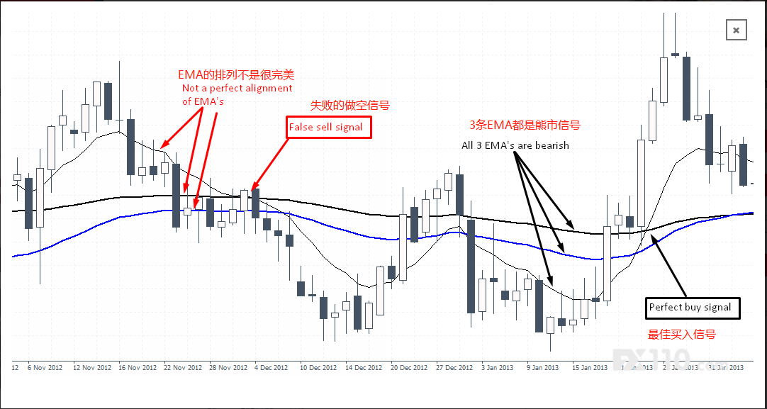 三重指数平滑平均线交易策略,众所周知这是一种简单的趋势跟踪策略,其取决于所使用的移动平均线。三重指数平滑平均线交易方法包括使用长期的MA,中期MA和短期MA。移动平均线可以是指数型的,也可以是简易的,这取决于交易员的偏好。一般数值的时间范围是200、100、50或100、50、20或10。当然,对于移动平均线的数值(周期)没有特定的规则,这取决于交易员使用什么值。 定义 三重指数平滑平均线交易系统的原则是在上涨趋势中,逢低买进,在下跌趋势中,逢高卖出。 运用原则如下: 长期MA高于中期MA =上升趋势 因此,当短期MA信号看涨交叉时,逢低买入或回调。 长期MA低于中期MA =下跌趋势 因此,当短期MA信号看跌交叉时,逢高卖出或回调。 上面的规则很容易理解,止损和止盈,在于交易员想要设置在什么水平位置。可以设置追踪止损或固定的止损。本文将介绍一些独特的方法,教你捕捉潜在的买卖信号。在本文的后半部分,我们将使用100、50和10周期均线来举例。 三重移动均线:10 - 100周期均线交叉 当10均线和100均线相互作用时会产生做多或做空信号。不过,这并不是可以立即入市的信号。三重移动均线之前都是熊市(或者在卖出时看涨),则产生完美的10/100周期均线交叉买入信号。然后,10均线与100均线形成了一个看涨的交叉(但50均线仍低于100均线)。 下图显示的是一个错误的卖出信号和一个完美的买入信号。
