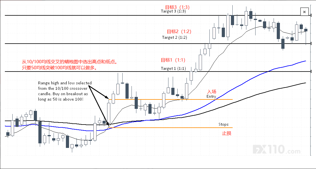10/100均线交叉:正确和错误信号之间的差异 既然已经确定了完美的(买入)信号,接下来是绘制引发10/100均线交叉的蜡烛图的高点和低点。然后,等待50/100均线(看涨)交叉和价格突破,或收于你选择的区间上方。 采取1:1,1:2和1:3 止损设置,并相应地移动你的止损位置。