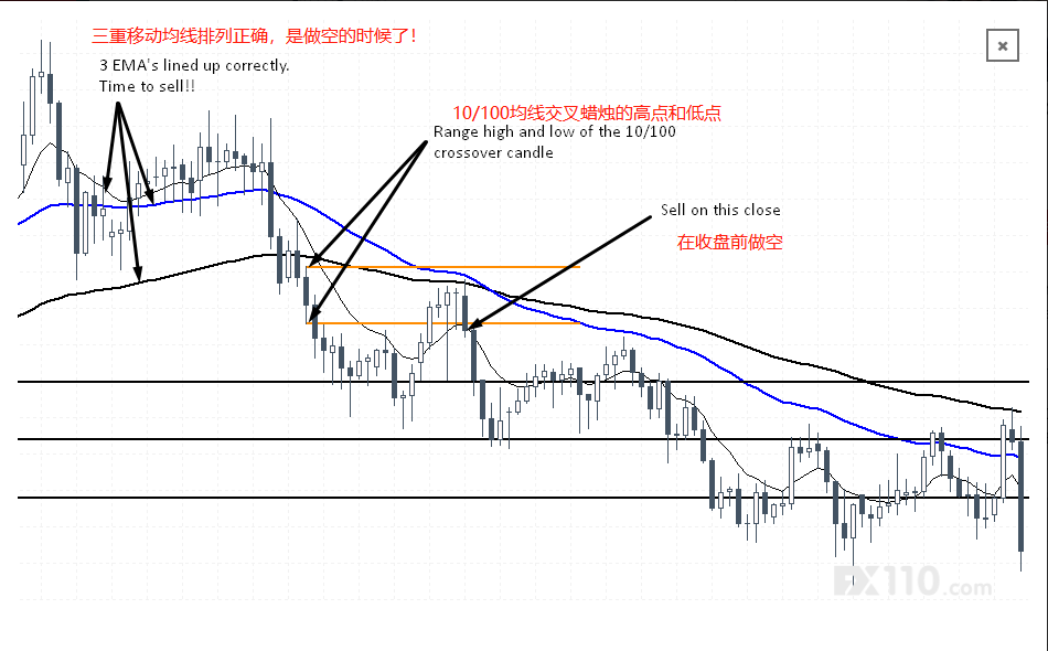 三重移动均线-买入信号 下图显示的是一个卖出信号,我们在50/100均线交叉之前做空。做空的原因是由于50和100均线斜率的性质。如果你等待50/100均线的交叉,你将错过一个入场机会(尽管还有其他的交易方式)。  三重移动均线卖出信号 在上面的图例中,在蜡烛图的低点突破处做空。入场时有50/100均线交叉,均线的斜率表明会有看跌交叉。在这个例子中,交易达到了目标T1,T2,但是还未到达目标T3,却在目标T1附近徘徊停滞不前。 并不是所有的设置都有效 用这种方法交易的诀窍是有足够的时间看图表来熟悉这种模式。如下图所示,在10/100均线交叉设置范围后,价格需要一段时间才会触发信号。当然,你可以在第一次突破或第二次回撤时入场做多。不管交易是否能入场,留意这两笔交易都能让你有利可图。  在某些情况下,根本不会被触发交易信号。下图显示的是一个做空信号,没有触发做多交易信号,却很快窜到目标T3位置。  三重移动均线:多头交易未能触发 如上面的举例所述,这种独特的交易三重均线的方式提供了一种客观的交易方式,可以在设定了可控风险/回报的情况下进行交易。 为什么这个设置是有效的? 这一交易设置因势头强劲而非常有效。当10EMA穿过(50均线和)100均线时,表明价格价格上涨势头很强劲。因此,基于随后出现的下跌或反弹,可以放心地入场交易强劲势头的行情方向。 |