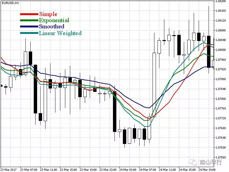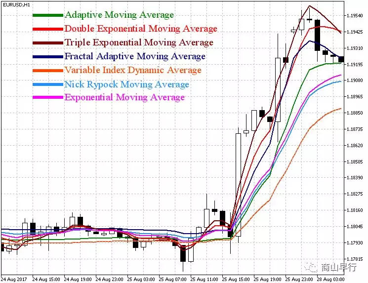 在外汇市场中移动平均线 (MA) 是最受欢迎的技术指标之一。我们的目的是研究各种 MA, 并在平等条件下比较交易的入场和离场。 我们来研究七种类型的移动平均线: 移动平均线, 自适应移动平均线, 双重指数移动平均线, 分形自适应移动平均线, 三重指数移动平均线, 可变指数动态平均线, 和尼克·洛普克移动平均线。 移动平均线的类型 本节包含一些简述和公式来计算有关的移动平均线。 移动平均线技术指标 移动平均线 是最广泛的技术指标之一。它描述了品种在给定时间周期的价格平均值。MA 指标存在各种的变体: