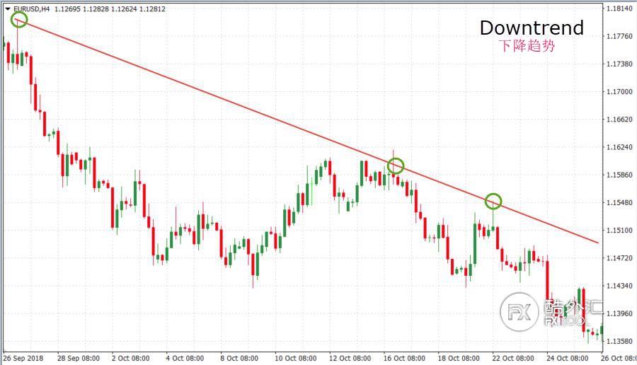 1.在趋势线上寻找至少三个点 使用趋势线进行交易时,请确保价格至少触及趋势线三次。虽然价格仅触及趋势线两次也可绘制趋势线,但这些趋势线不应该被视为与交易相关。 使用趋势线进行交易时,最常见的错误之一是交易仅与价格触及两次、且未经确认的趋势线。根据经验,价格在过去触及趋势线的次数越多,趋势线就变得越重要。 下图显示了EUR/USD图上已确认的趋势线,该趋势线到目前为止已测试了三次。如你所见,下降趋势线在下降趋势中连接了连续的较低高点。交易员可以在价格从下方到达趋势线、触及趋势线后反转时做空。止损指令应放置在趋势线上方。