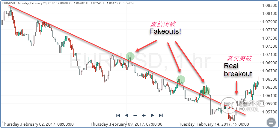 3.识别虚假突破 使用趋势线进行交易时,虚假突破很常见。对于缺乏经验的交易员而言,当他们交易趋势线突破时,通常很难区分真实突破和虚假突破。 当价格看起来像要突破趋势线之上或之下时,结果却突然反转,此时通常会发生虚假突破。这种情况下,交易虚假突破的交易员只能是亏损。 下图就是一个虚假突破的例子: