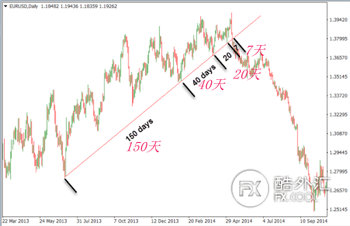 2.测量连续触及之间的时间 除了交易趋势线反弹外,你还可以考虑在下降趋势线之上和上升趋势线之下交易突破。在这些突破交易之后,通常会在突破方向上产生较大的交易动量,这也使其成为了日内交易员中流行的交易方法。 然而,在突破发生前,价格趋于围绕趋势线聚集,并且其连续触及的时间趋于变短。 下面的图表很好地解释了这一点: