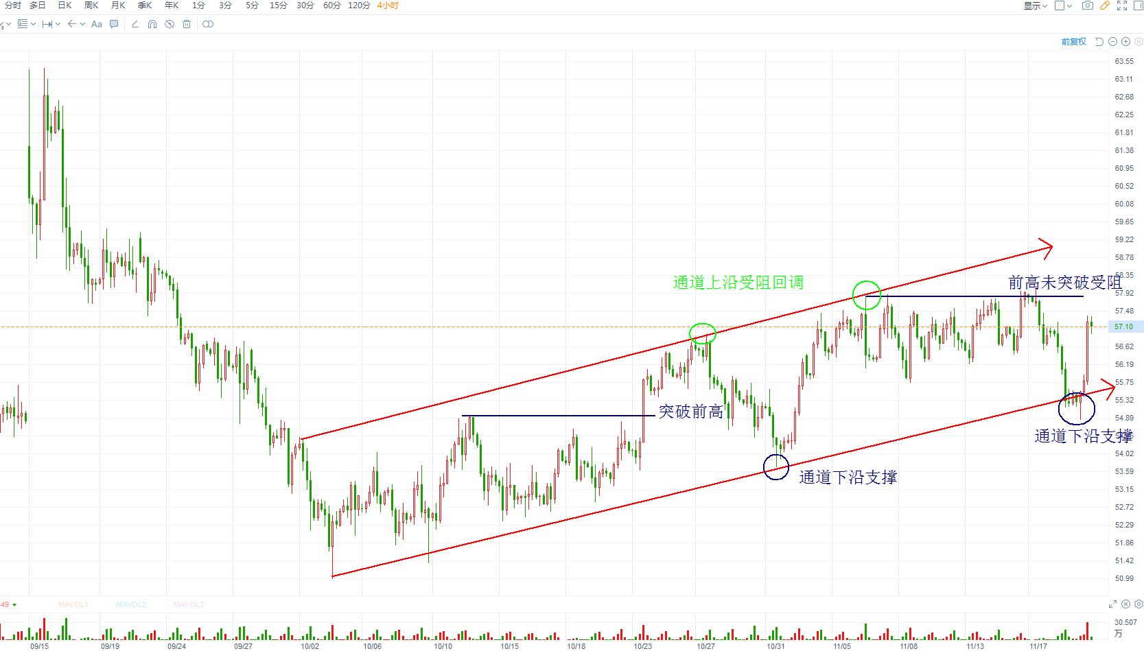 下面我从我多年从事交易的角度通俗的理解就是讲:因为,当价格下降靠近支撑位而变得“便宜”时,做多者倾向于买入或是持有期待价格上升,做空的倾向于观望或是止损。从供需角度看,市场需求会超出供给以防止价格进一步下降。检验支撑是否有效的标准就是看多空双方力量博弈谁占优势,多方占优——止跌企稳。空方占优——破位下行。阻力位也就是把上述支撑位的观点反过来理解。我就不一一解释了。 当然,从技术分析的角度“支撑与阻力位”可以结合多种分析方法,比如均线理论,斐波那契,K线形态等。 接下来我简单介绍下我自己常用的支撑与阻力位的案例主要结合量价关系来分析。(以21号隔夜收盘的WTI油价为例,仅从技术面的角度)。 1.上升趋势中的通道运行,通道的上下沿,前期的高低点。在上升趋势中阻力位必定是用来突破的。如下图(WTI-240分钟 截至21号的图,20号大跌3%今天又大涨3%)