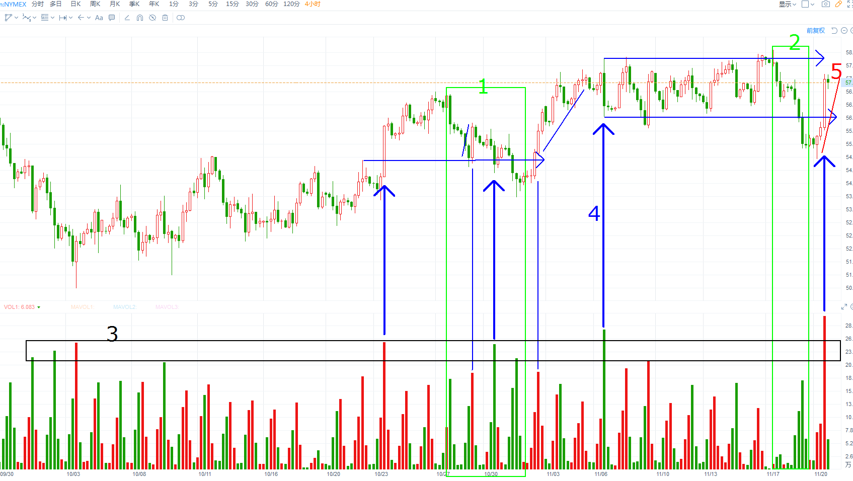 ——图中所有蓝色箭头(4)为成交量相对加大时的价格,(5)的量能已经突破(4)区也是今天WTI 大涨3%的量能 ——绿框,(2)区相较于(1)区的下跌没有明显的放量,这也是今天WTI能够收复昨日跌幅阳包阴的 一大原因。 ——(3)为成交量相对较大的能量柱. 当然,第三条的分析归结到底还是针对量价关系的分析,上面仅做简要分析。 风险提示:上文所示观点,都有其特定立场,投资决策需建立在独立思考之上。 |