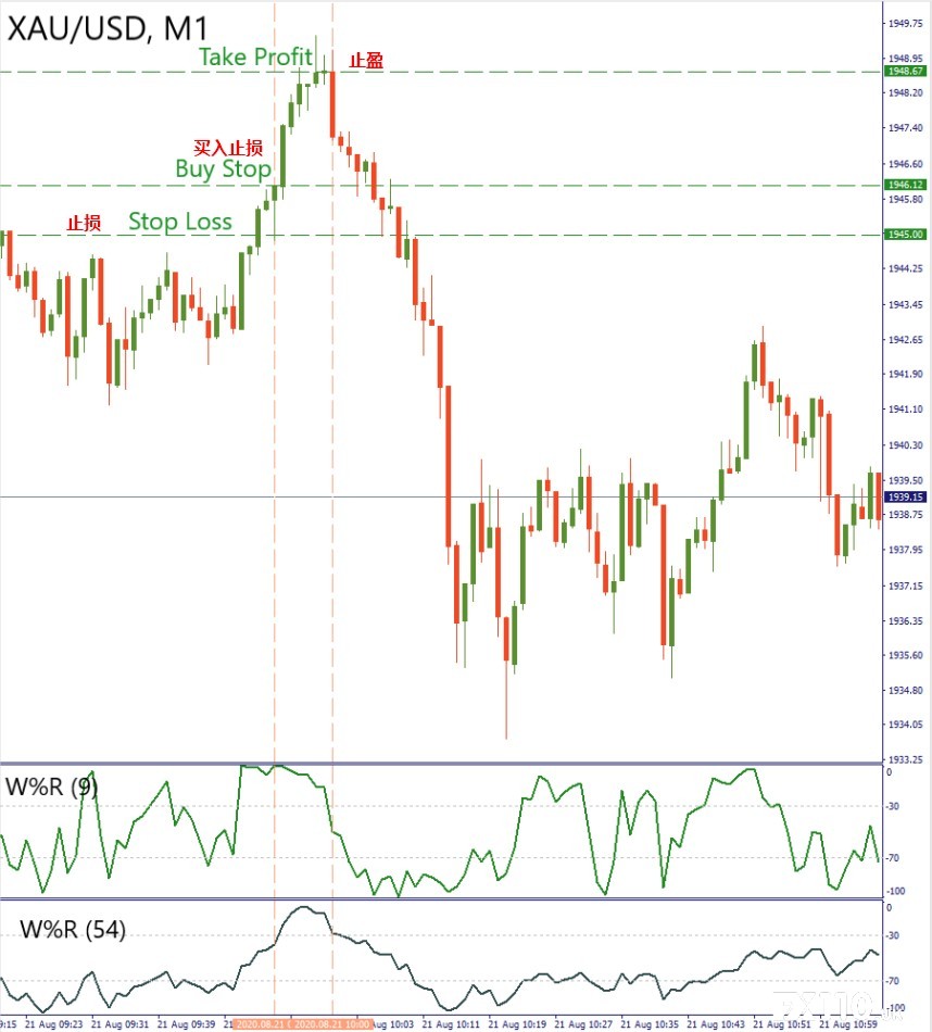 策略2 — 黄金-剥头皮交易 第二种策略是为喜欢交易黄金并想学习如何剥头皮交易贵金属的人提供的。请牢记,你需要密切关注走势图。 关键点: · 时间范围:M1 · 资产:黄金,白银 · 指标:威廉指标:快(9)和慢(54),周期为-30和-70 “买入”的步骤 当慢速和快速振荡均突破-30时进行买入操作,当快速振荡(9)离开该区域时进行平仓,止损比附近的支撑位低几个点。 “卖出”的步骤 当考虑建立空头头寸时,需要在慢速和快速振荡指标均跌破-70以下时卖出,并在快速震荡离开该区域时平仓。止损位于阻力位附近上方几个点。 下面看到一个多仓示例。当慢速和快速振荡指标均高于-30水平,达到1 94.6.12时,建多仓;当快速振荡指标穿过-30向下水平时,我们在1 948.67平仓。 1 945表示止损位置。