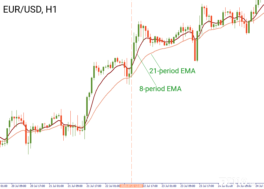 在很多资料中,剥头皮被定义为一种短期交易方式,它有助于在一天之内尽可能多地通过小幅价格变动获利。 专家们认为,剥头皮交易是一种非常冒险的交易方法,因为需要整天关注走势图, 因此,作为一位剥头皮交易者需要精打细算,并密切关注市场, 正确了解风险管理技巧以及设置入市和止损水平非常重要。今天,我们将为大家分享一些有效的剥头皮交易策略。 假设你是一位剥头皮交易者: · 在较小的时间范围内进行交易(M1,M5,M15); · 喜欢冒险,并准备拿出所有时间放在交易上; · 在波动/繁忙的市场中进行交易; · 喜欢持有大仓量以从短期交易中获得更多回报。 如果你有两个以上问题的回答是“是”,那么你就是一位真正的剥头皮交易者!我们下面要解释的策略很容易理解,相信你们中的任何人都可以尝试一下,看看它的效果如何。 策略1 — 5分钟剥头皮策略 关键点: · 时间范围: H1, M5 · 货币对:点差小的流动货币( 欧元/美元,英镑/美元,美元/瑞郎,美元 /日元) · 指标: 8-, 21-, 和13-EMAs “买入”的步骤 1. 首先,我们需要确认趋势正在下降。为此,打开H1走势图并插入8-和21- EMA。要做到这一点,请打开Metatrader,然后单击“插入” — “指标” — “趋势” — “移动平均线”。 2. 对于“买入”情况,我们需要看到上升趋势。要确认这种趋势,8-周期EMA应该高于21-周期EMA。 移动平均线不应相互交叉。 3. 现在我们转到M5并插入13-周期SMA。需要该移动平均线才能看到8周期EMA和21周期EMA之间的差距,差距越大,趋势越强。 4. 等待蜡烛柱触及8-周期EMA的底部,这是交易的触发点。 5. 在触发点之前出现的蜡烛柱中找到最高的那根蜡烛柱。 6. 在此蜡烛柱的高处建仓,在触发柱的低点止损。 7. 第一个止盈设置在买入和止损之间相同的距离处。如果H1上的趋势仍然强劲可以加倍投入,并在比进场止损距离大两倍的距离上平仓。 我们来看下示例图,我们看的是7月22日的欧元/美元走势图。在H1上,可以看到价格在上升趋势内波动,8-周期的指数移动平均线移动到21-周期的上方。