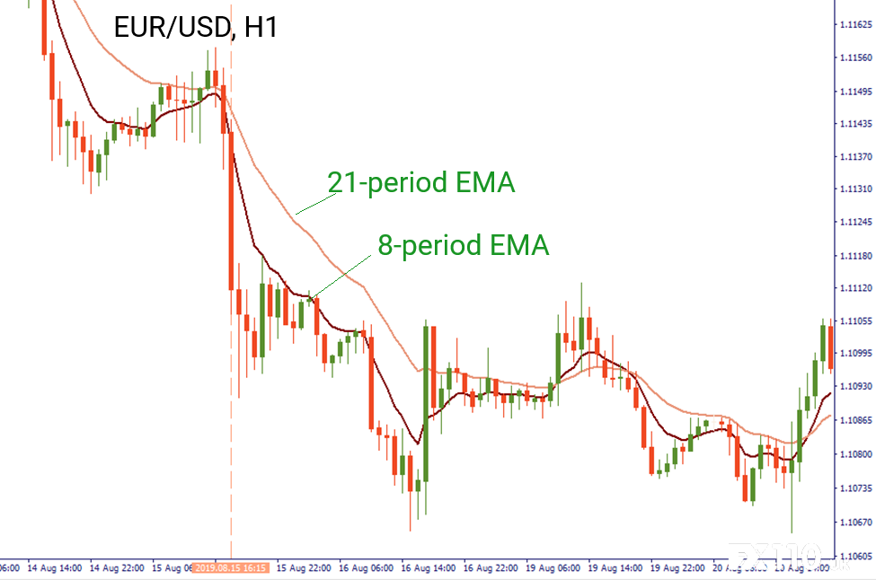 “卖出”的步骤 1. 在H1上,8-周期EMA应该低于21-周期EMA,确认了下降趋势。请记住,与“买入”情况一样,移动平均线不应相互交叉。 2. 我们将注意力转向M5走势图,并在此处放置13-周期的SMA。趋势越广,趋势越强。 3. 然后等待蜡烛柱触及8-周期EMA的高点,这是交易的触发点。 4. 在触发点之前的蜡烛柱中找到最低的蜡烛柱。 5. 在此蜡烛柱的低处建空仓,在触发柱的高点止损。 6. 第一次止盈与止损的规模一样,第二次止盈比入市和止损之间的距离大两倍。 在欧元/美元的H1走势图上,我们注意到该货币对在下降趋势中移动。8-周期EMA跌破21-周期EMA。