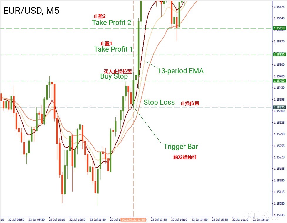 现在切换到M5,并等待蜡烛柱通过其下阴影来测试8-周期EMA。触发蜡烛柱发生在7月22日12:55。我们从触发点数5根蜡烛柱,然后选择最高的蜡烛柱。在1.1545建一个买入仓,在最高蜡烛柱的高处设置“买入止损”订单,止损位于触发柱的低点1.1537时,获利水平计算为: 1.1545-1.1537=0.0008 止盈1 = 1.1545+0.0008=1.1553 止盈2 = 1.1553+0.0008=1.1561