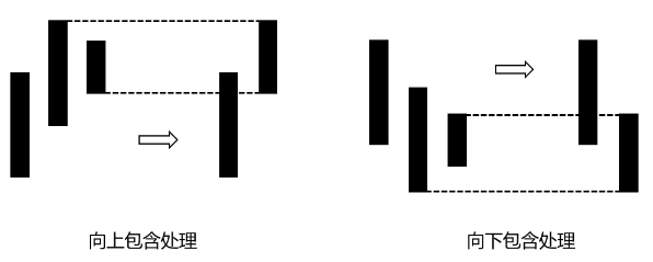 一、具体理解分型和笔之前,必须先学习包含关系 包含关系,也就是一K线的高低点全在另一K线的范围里,这种情况下,在向上时,把两K线的最高点当高点,而两K线低点中的较高者当成低点,这样就把两K线合并成一新的K线;在向下时,把两K线的最低点当低点,而两K线高点中的较低者当成高点,这样就把两K线合并成一新的K线。经过这样的处理,所有K线图都可以处理成没有包含关系的图形。