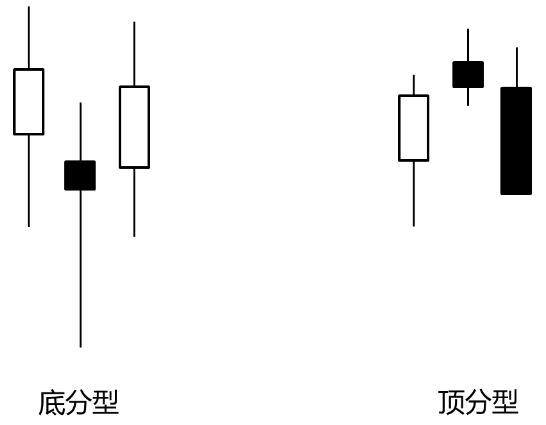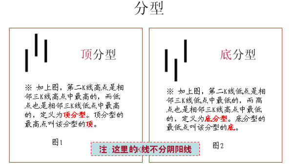 二、顶底分型:分型,很好理解,由三根K线构成 顶分型:相邻三根K线中,第二根K线的高点是三根K线中最高的,低点也是相邻三根K线低点中最高的。顶分型的最高点也是该分型的顶。 底分型:三根K线中,第二根K线的低点是相邻三根K线中最低的,而低点是相邻三根K线低点中最低的。底分型的最低点也是该分型的底。