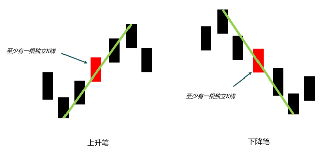 不论是何种级别的走势都遵循这个道,只不过不同级别能量有所差异。这就是走势的自同构性,在日线图有顶底分型,在1分图中也有顶底分型,链接此二者的走势类型也具有自同构性,在不同的级别上,级别不同但是结构相似。这也是我们深入理解走势非常重要的思想。正因为如此,走势才可以被理解,才能把握。 本质上,我们要把握的就是这个自同构性。我们都知道自同构性就如同基因,按照这个基因,走势就如同有生命般自动生长出来,由分型、笔、线段,中枢、走势类型作为部件,产生不同的级别的不同走势,不论构成走势的人如何改变,只要人性的贪嗔痴疑不改变,那么自同构性就会存在。 三、严格笔的概念 分型是万物之始,所有的上涨行情都是由底分型开始,所以底都是底分型的最低点。 所有下跌行情都是因为见顶,那么顶就必须是顶分型的顶点。在顶底分型的辨析中,我们还要区分的就是中继顶底分型,中继的意思就是中途继续上涨或者下跌,这样的顶底分型往往是力度不够的结果。 所以如何区分中继分型,就要用到次级别的线段,甚至特征序列去精确。这个我们后面会讲。用一个最简单的比喻,膝盖就是分型,而大腿和小腿就是连接的两笔。 链接相邻顶底分型,经过包含关系处理后,在顶底分型之间至少共有1根K线称之为笔。满足结合律的底分型+K线+顶分型是为向上笔,顶分型+K线+底分型是为向下笔。这里的K线一定是包含关系处理之后独立的K线,而且可以是无数根。 在缠论后文有讲到新笔的概念,新笔是建立在标准笔定义之上,关乎本身笔的能量力度,笔和新笔的顶底分型在经过包含处理后,不允许共用K线,这就是力度的保障,而新笔在顶底之间,不包括顶K线和底K线,中间至少有3根或以上K线,不考虑包含关系,顶底分型之间有缺口的也算笔,这样就可以应对一些特殊情况下的笔。 笔的作用是链接顶底。 在日线图中的一笔,在30分钟里就是一个完整的走势类型。由此可知当日线顶分型条件成立后,我们要观察的就是日线向下笔的过程,可以在30分钟、5分钟里找到卖点。如果是日线底分型成立向上形成向上笔的过程,我们就要去30分钟或者5分钟里找到买点。
