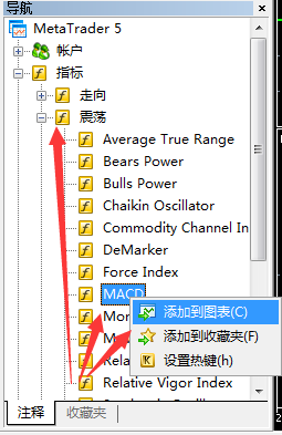 很多投资者都是在网上下载双线MACD,今天小编教大家一个新技能,直接在MT5中添加双线MACD。 MT5怎么添加双线MACD一:在导航栏找到指标,然后可以看到震荡一栏,打开找到MACD指标,点击鼠标右键,选择“添加到图表”