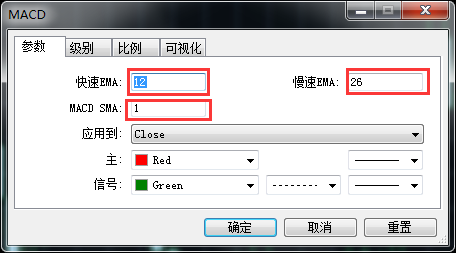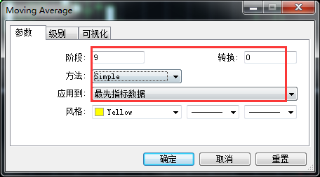 六:拖到图表中就会跳出设置参数的框框,阶段为9,转换为0 ,方法设置为Simple,应用到选择最先指标数据,再点击确定。 这样我们就添加好双线MACD啦!