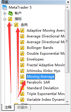 五:在指标栏可以看到走向一栏,然后找到Moving Average,鼠标左键按住往MACD图表中拖
