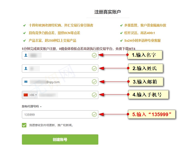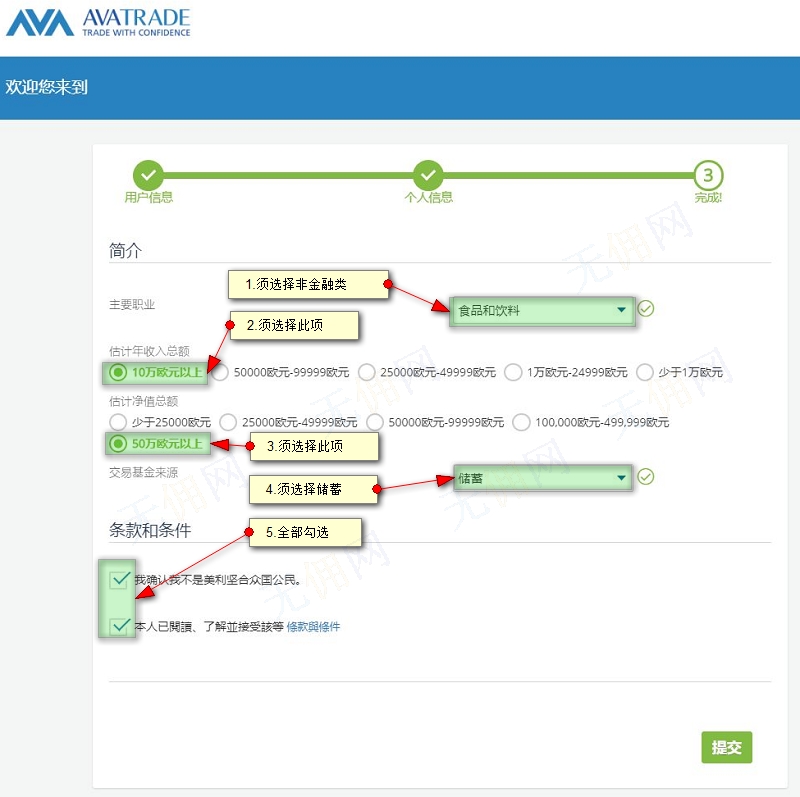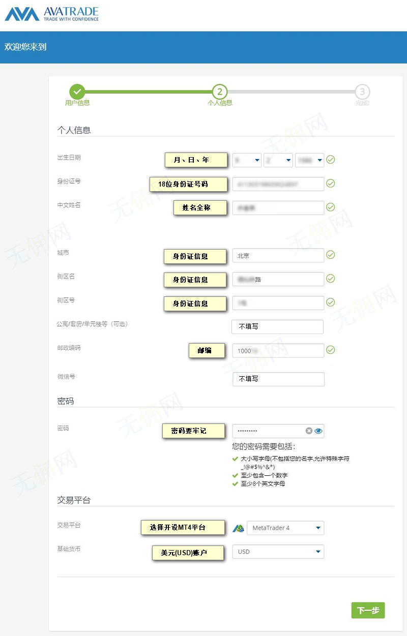 2.银行卡信息:本人银行卡的卡号、支行全称等信息。 二、正式开户流程1. 开设交易账户 爱华亚太区客户主要使用MT4软件。客户点击开户链接进入开户界面:AvaTrade爱华官方开户链接 打开上述开户链接后,在 “注册真实账户” 页面,按如下五个提示填写个人信息,最后的服务商代理号码填写:146441 。若您是非首次开设爱华交易账户,在“3.输入邮箱”时,更换个邮箱填写即可。