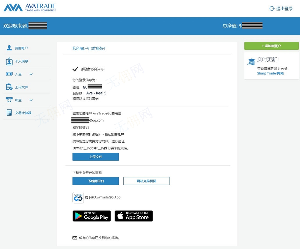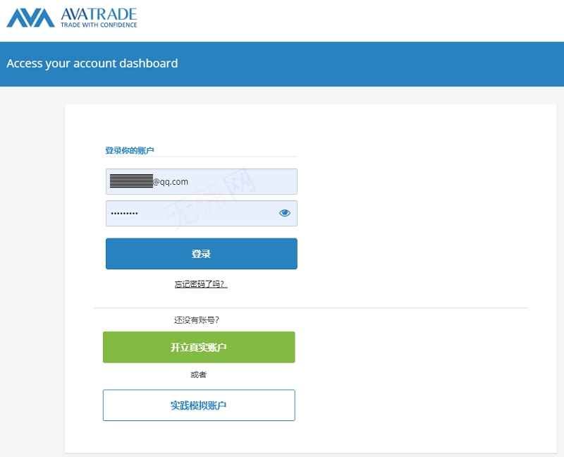 至此,开户工作全部完成。交易账户和网页个人账户管理中心均可正常使用了。 2. 个人账户管理中心要注意,A.登录MT4软件需要 交易账号和密码;B.登录网页“个人账户管理中心”需要 注册邮箱和密码。两个密码完全相同的。 客户可通过AvaTrade网页“个人账户管理中心”提交您的身份证明资料(前面开户最后一步,在此不再赘述)、出入金管理等操作。开户后的客户,日常出入金操作,查看出入金汇率等,在此管理中心进行。 ⑴ 登陆 操作 点击此处 “账户管理中心”打开登陆页面,输入注册邮箱和密码,登陆成功。