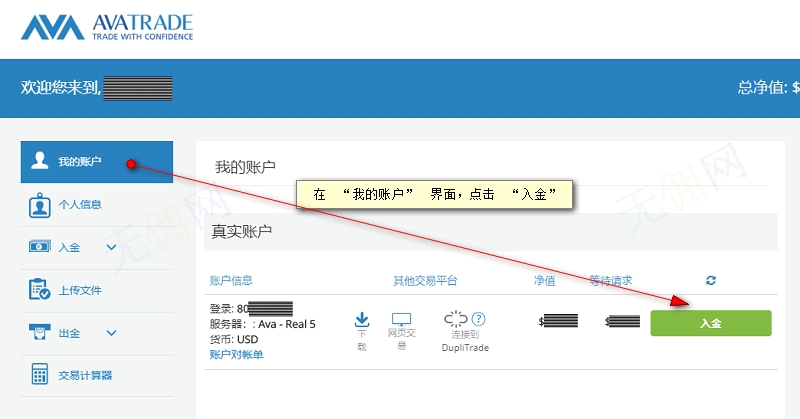 ⑵入金 操作 在 “我的账户” 的 实盘账户后面,点击 “入金” 。