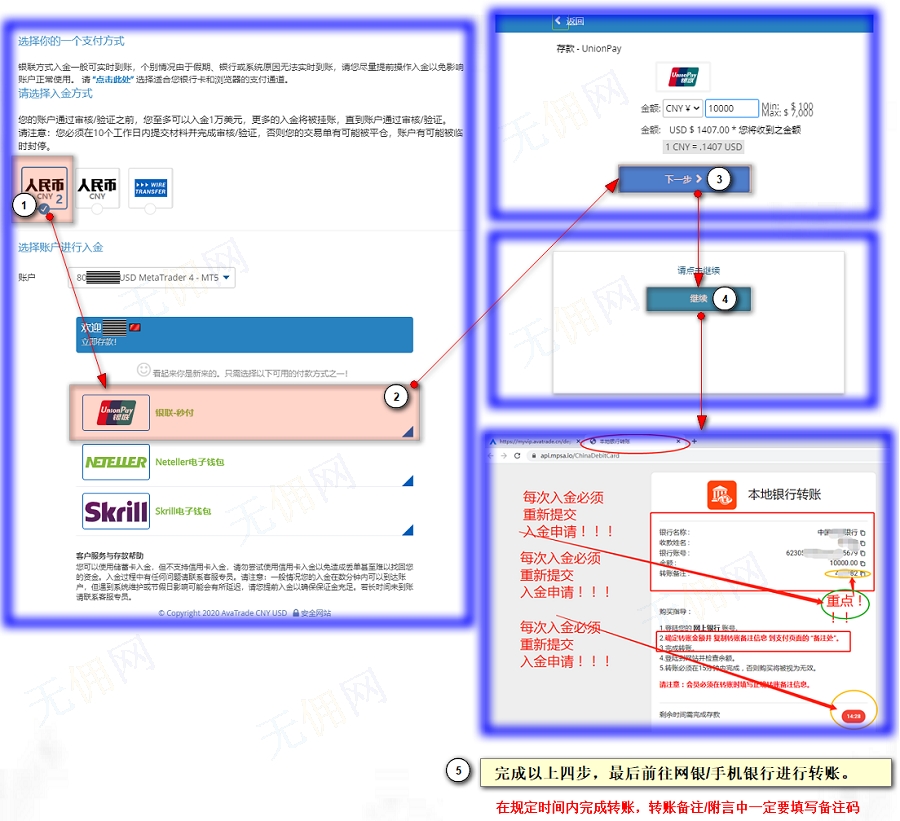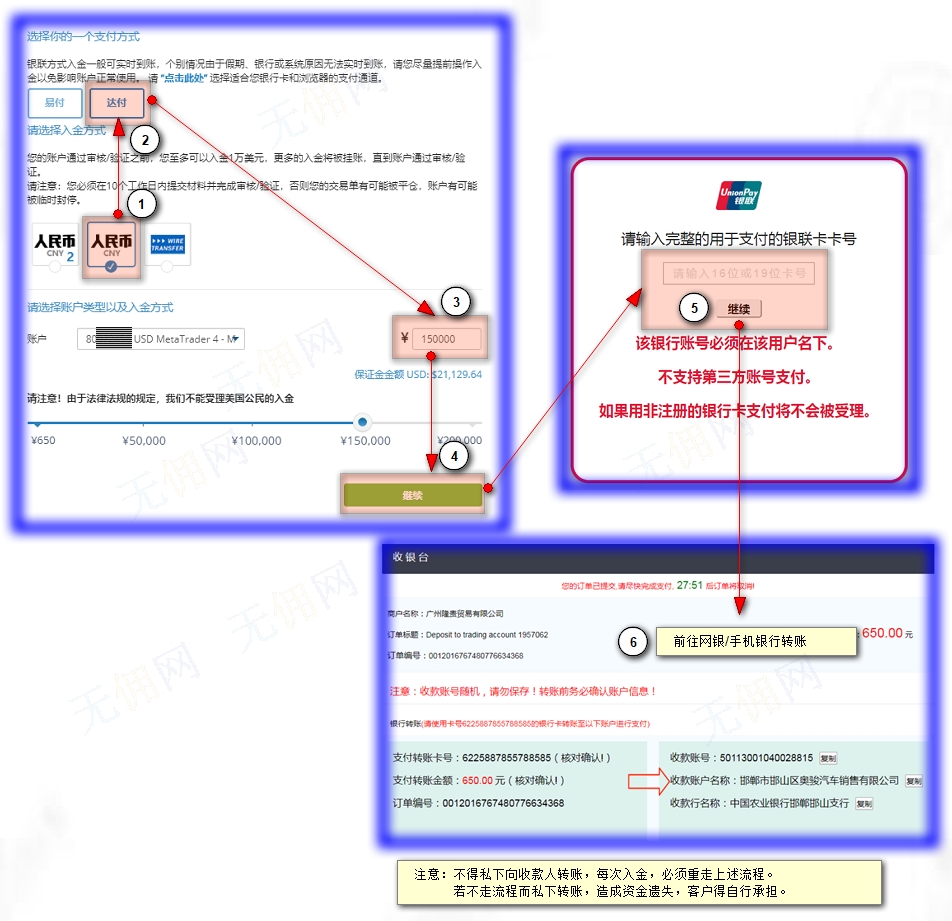 之后有多种入金方式,目前无佣网客户最常用的有两种入金方式选择:二选一 第①种入金方式:人民币2(入金货币)——秒付 :秒付入金每笔在100到7000美元(等值人民币)之间,每日不限次数。每次生成的备注码有效期仅有15分钟,请每次在15分钟内完成转账入金操作。完整演示流程如下图:共五步