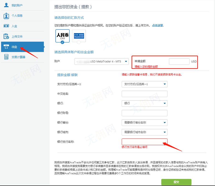 ⑶出金 操作 客户从交易账户取款,即为通俗所说的 “出金”。 ①点击左侧 出金 选项 ②选择交易账户,并输入申请的提款金额。 ③选择支付方式,请选择 银联出金 ,秒付/达付任选其一。 ④输入中文姓名、选择开户银行、填写银行账号(必须为本人银行卡)、选择银行省份、选择银行城市、银行支行名称。 ⑤(确认银行卡信息无误后,请点击提交。正常情况下,提现金额将在1-3个工作日内到账。 如下图: