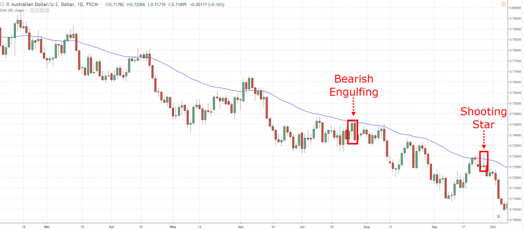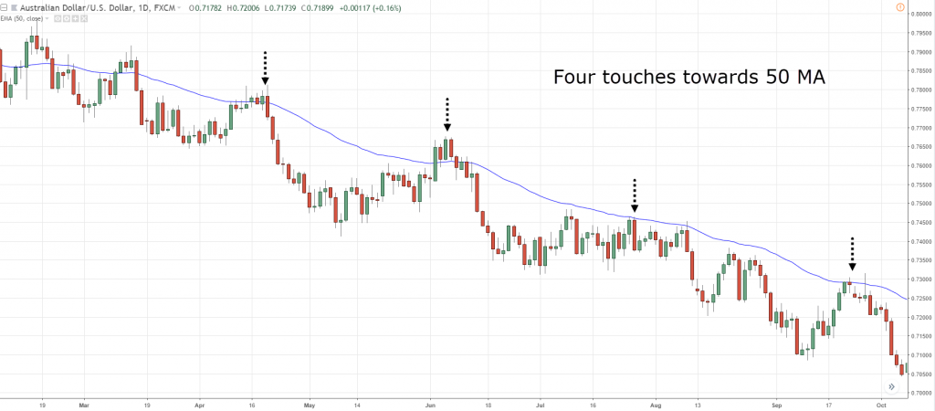 如上图所示,市场价格测试50MA 4次,每一次测试你需要做的是等待市场价格重新返回到移动平均线的同一侧。 还可以结合K线形态交易,在价格最后2次测试50MA时,分别出现了看跌吞没形态和看跌锤子线,这也是进场看空的切入点。