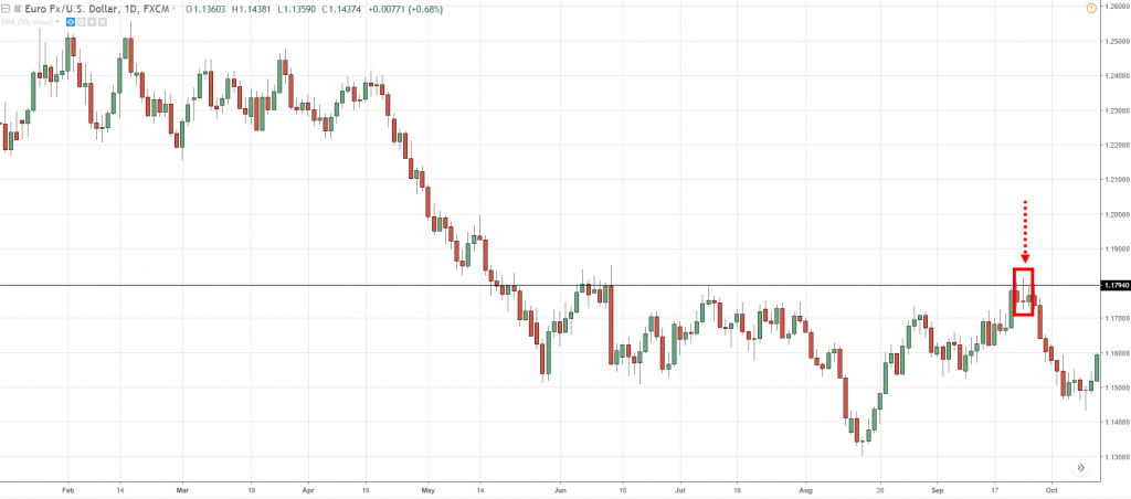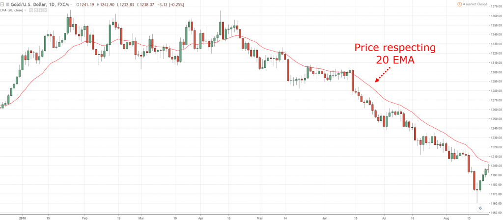 那我们如何交易强劲趋势呢?在趋势交易中一般的思路是寻找突破高点或低点。但正如这个强劲下降趋势,市场价格很少向上测试移动平均线或者阻力位,所以基本上没有价格回调的高位进场机会。如果你一直等待高点突破,可能会错失机会。 所以我们要找的是突破低点,当市场价格突破低点,你可以选择进场做空。 将止损设置在移动平均线上方,留足空间,防止价格突破20EMA。