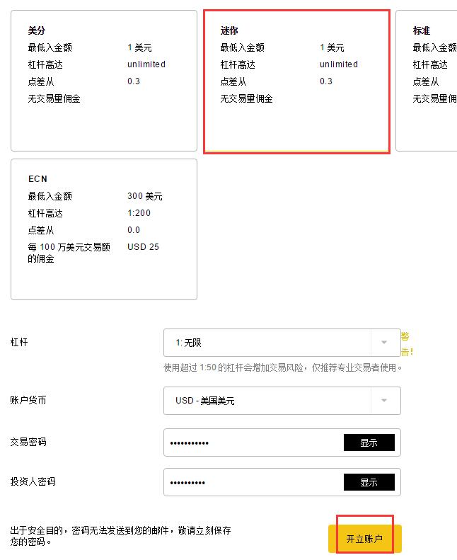 4.在“主页”选项里面,选择“开立新的交易账户”。 ![]() 5. 如图,我们推荐你开设迷你账户,交易无限制,返佣更多。