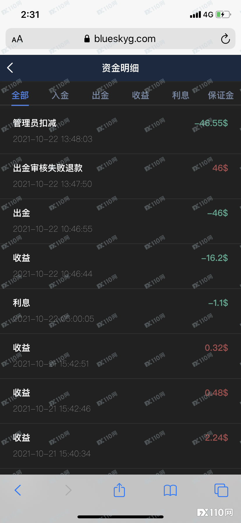 以赠金引诱开户,却自动抹除客户账户资金 据一位汇友爆料,其是之前看到Blue-sky有个赠金活动,开户就送300美金赠金,要求只要盈利满多少手就能出金。开户交易了几天之后,汇友准备出金46美金却被拒绝了,平台客服表示汇友涉嫌恶意刷单,所以无法出金。紧接着,汇友发现自己账户自动被扣除了46.55美金。