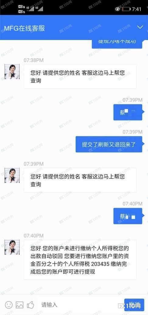 我们常说,一定要用闲钱投资!无论是炒股还是炒汇,在生活不受影响的前提下理性参与,才是投资理财的真谛。借钱投资,风险加倍不说,心态也很容易受影响,要是遇上黑平台,徒惹一身债。 近期,我站接到一汇友爆料,称其借了15万在MGF平台炒汇,账户很快就翻了十几倍,本想着盈利后出金把欠的债给还了,现实却给了他当头一棒! 入金15万飙至203万,出金需先缴纳20余万 据汇友描述,其是经他人介绍进MGF平台的,因为听信了他人所说的“有大师带着做单,保证赚钱”,汇友前后借了15万元,全部入金了MGF平台。用汇友的话说,自己欠了几十万房贷,既然找到了“稳赚”的好路子,便想着“借鸡生蛋”,盈利后把借的钱还了,还能减轻房贷负担。 在“大师”的喊单指令下,汇友的盈利之路走得非常顺畅,眼看着账户的15万本金渐渐飙升至203万余元,汇友便想着提现。然而,现实是骨感的,汇友的出金申请屡次被自动驳回!询问平台客服,客服表示汇友需要缴纳账户资金10%的个人所得税,也就是203434元,缴纳完成后方可进行提现。所幸,汇友没有继续借钱去缴这笔高达20余万的个税,转而向FX110提交了投诉。