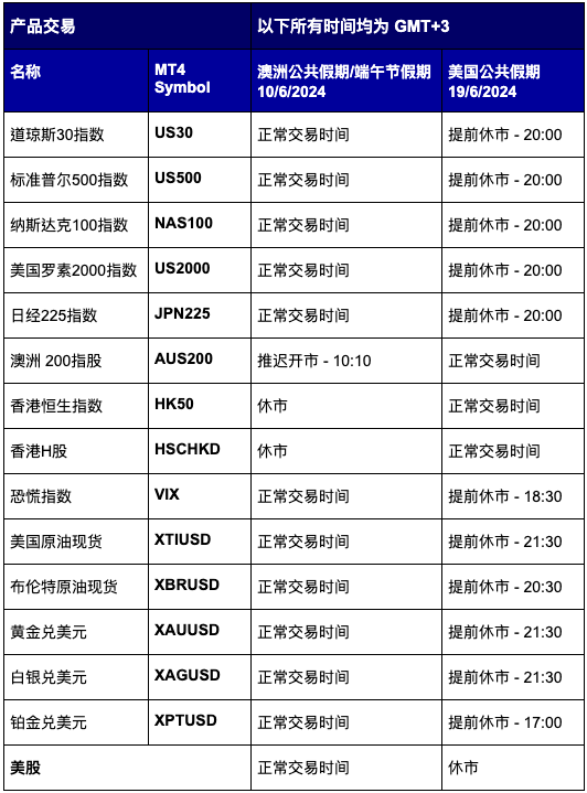 请您留意即将到来的假期,受此影响部分交易产品的交易时段将会有所调整。 我们建议您关注我们平台上更新的交易时间表,确保您在此期间能及时调整交易策略。 六月交易时间变动 *以上时间仅供参考,请以实际开盘时间为准 出入金时间变动 因受2024年澳洲公共假期以及端午节假期的影响(6月10日星期一),我们的出入金时间会做出相应调整,具体如下: 入金:因6月10日为澳洲公共假期,电汇入金将暂停处理,并且会延迟的下一个工作日(2024/06/11)按照申请顺序进行处理。其他入金方式不受影响。 出金:因6月10日为澳洲公共假期,电汇出金将暂停处理,并且会延迟的下一个工作日(2024/06/11)按照申请顺序进行处理。人民币出金审核处理一切照常,但是由于银行受端午节假期的影响,到账会有所延迟,预计1到4个工作日内到账。其他出金方式不受影响。 除此以外的所有交易产品不变,请交易者留意本次交易时间的变动,并请您时刻关注账户情况,确保有充足资金以对行情变动。 感谢您对TMGM一直以来的支持与信任。 祝您交易顺利, TMGM中文服务 |