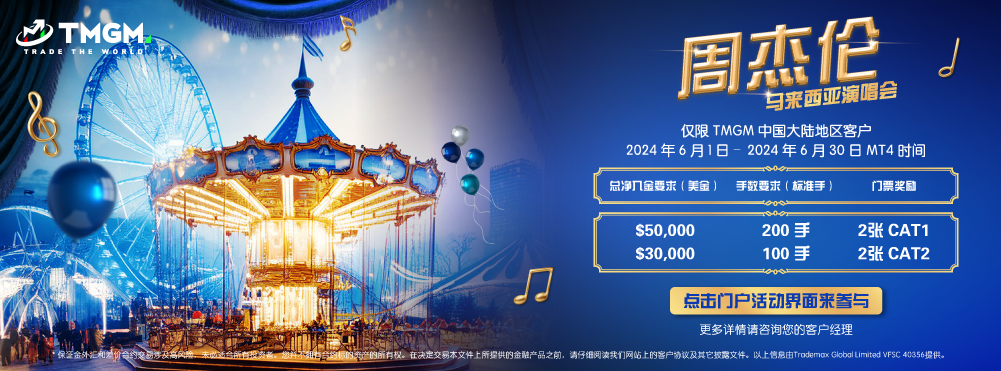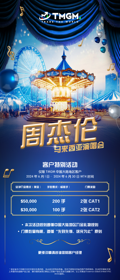 | 在璀璨星河下,音乐与金融的交响曲再度响起。TMGM,作为全球领先的经纪商,荣耀宣布将再度携手华语乐坛天王周杰伦,共同打造2024年10月26日于马来西亚吉隆坡举行的《2024嘉年华世界巡回演唱会》。这不仅是一场视听盛宴的延续,更是双方在艺术与商业领域合作的又一里程碑,彰显了TMGM对于文化传承与创新的不懈追求。 音乐无界 《嘉年华2024》世界巡回演唱会 – 马来西亚站是TMGM品牌理念的再度诠释。如同周杰伦的音乐跨越时代,触动无数人的心灵,TMGM也致力于跨越传统金融的边界,以科技为翼,为全球投资者提供无缝、高效、安全的交易环境。我们相信,无论是音乐还是金融,其核心都是为了连接每一个独立而又渴望共鸣的灵魂,为生活带来更多的色彩与可能。 开演在即 门票特别活动 活动周期:2024年6月1日00:00:00 – 2024年6月30日23:59:59 MT4时间 活动范围:仅限TMGM中国大陆地区客户 领票须知:符合入金和手数要求后,客户在门户点击兑换。兑换成功后,将会提前一个月通知领取门票的方式。