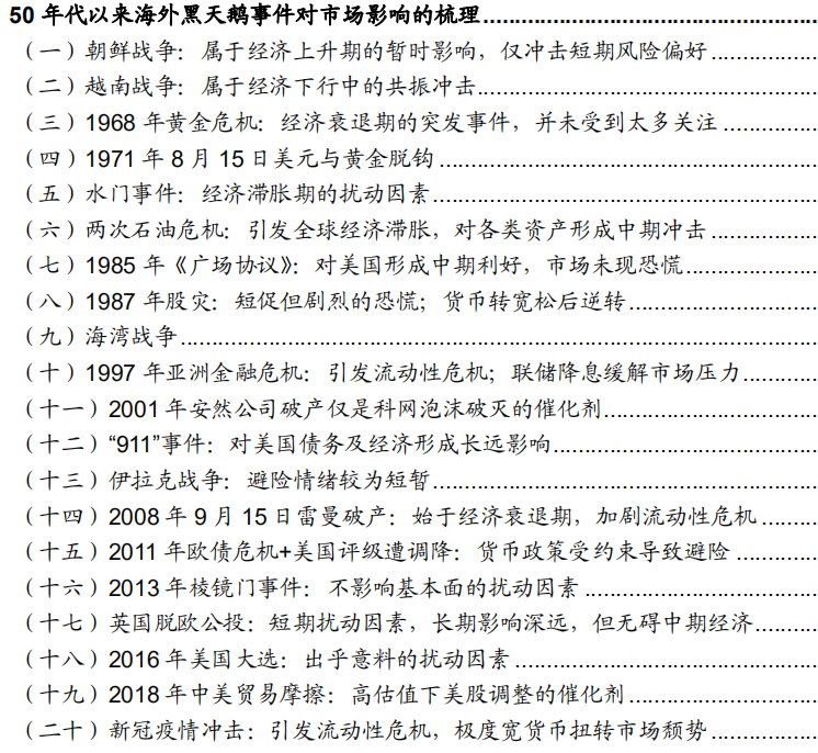 通过分析黑天鹅事件后各类资产的反应,我发现可以把黑天鹅事件归结为六种: 第一、嵌套在更大的基本面下以至于被市场忽略。 比如“黄金危机”、“水门事件”、“棱镜门事件”等。这些事件可能是孤立的、也可能是某些宏观背景下的产物,也出乎市场意料,但因其嵌套在某些更大的宏观背景下而被忽视。此类突发性事件一般不引发流动性风险,因此即便出现在经济下行期也不会对基本面产生更大打击(但不排除存在长期影响,比如黄金危机)。 第二、市场波动极大,但并未导致风险资产实质性、持续下跌。 比如英国脱欧公投(对英国也存在长期影响,但短期影响并不持续)、2016年美国大选等。该类事件仅是超出市场预期,可能存在长期影响,但并不影响随后一段时间的经济基本面。这种突发性事件并不影响各类资产运行趋势,但会在事件发生前后加剧市场波动,也可能带来很多资产的交易性买点。 第三、突发性事件推动风险资产出现急跌但调整时间较短。 比如各种短期地缘风险,朝鲜战争;又比如1987年股灾、2018年Q4美国股灾等。 该类事件仅影响短期市场风险偏好,或者因某类资产估值过高导致阶段性调整,而该类事件并不会引发经济基本面的变化,并且往往发生在经济复苏甚至过热阶段。一旦风险事件结束,或者货币政策放松,态势对于市场的影响就将结束。