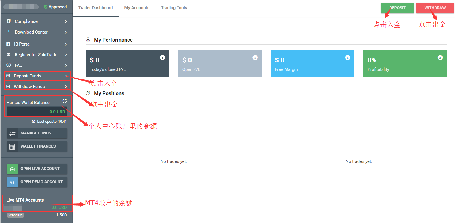 2、左侧一栏显示了个人中心账户里的金额以及MT4账户里的余额。 左侧一栏和右上方都有入金出金的按钮,点击入金。