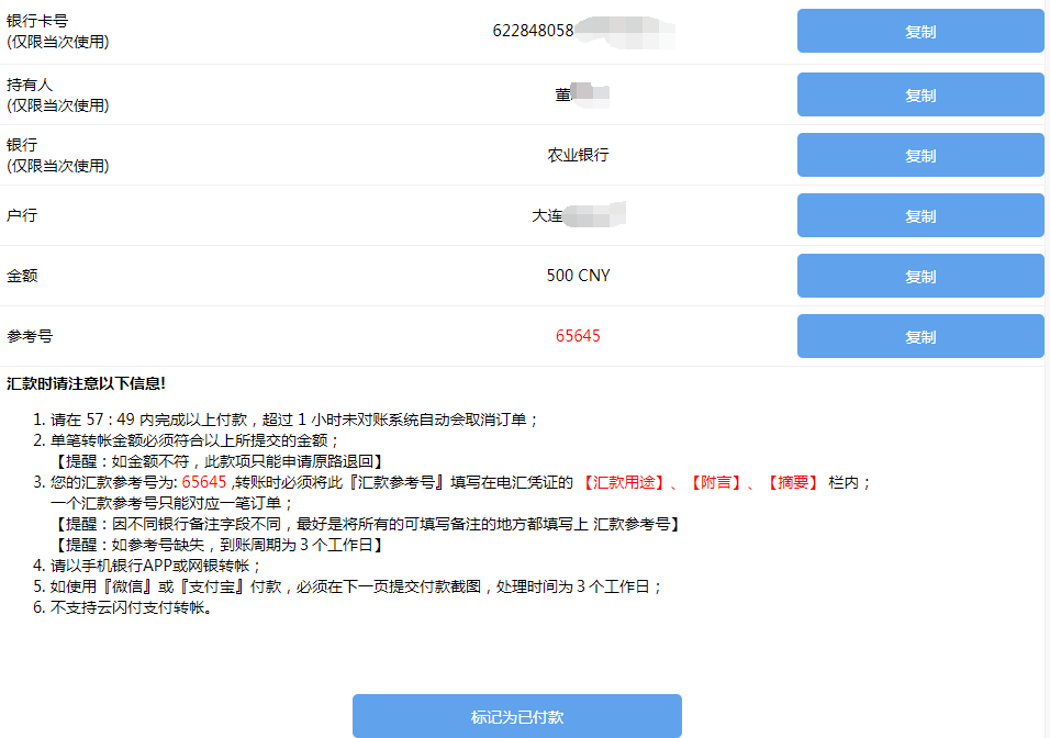 4、之后按照出现的页面上的要求操作,将钱汇款到这个账户中。 注意:参考号一定要记住,填写在电汇凭证的“汇款用途”“备注”“附言”“摘要”栏内(不同银行备注字段不同) 完成后点击标记为已付款就可以了。