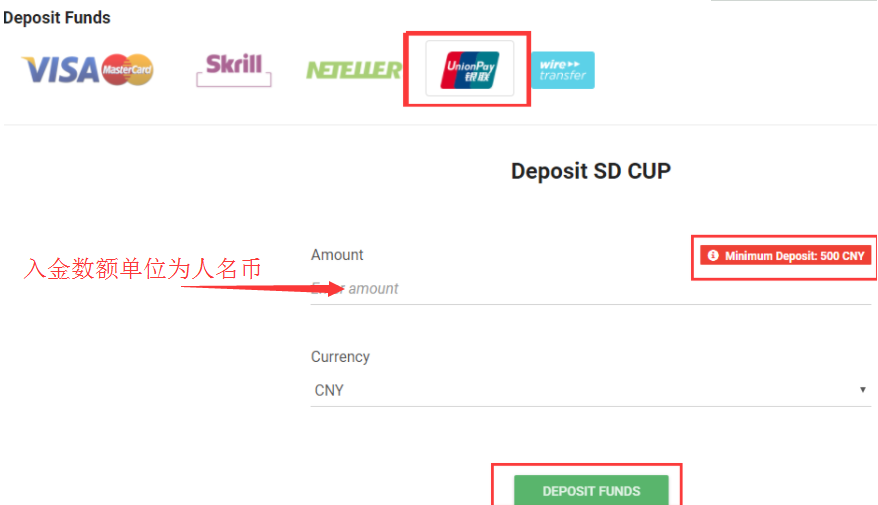 3、会看到一共有5个入金方式:点击第四个银联入金。(最少入金500人名币) 注意:这里填写的入金数额是人名币为单位 然后点击下一步。