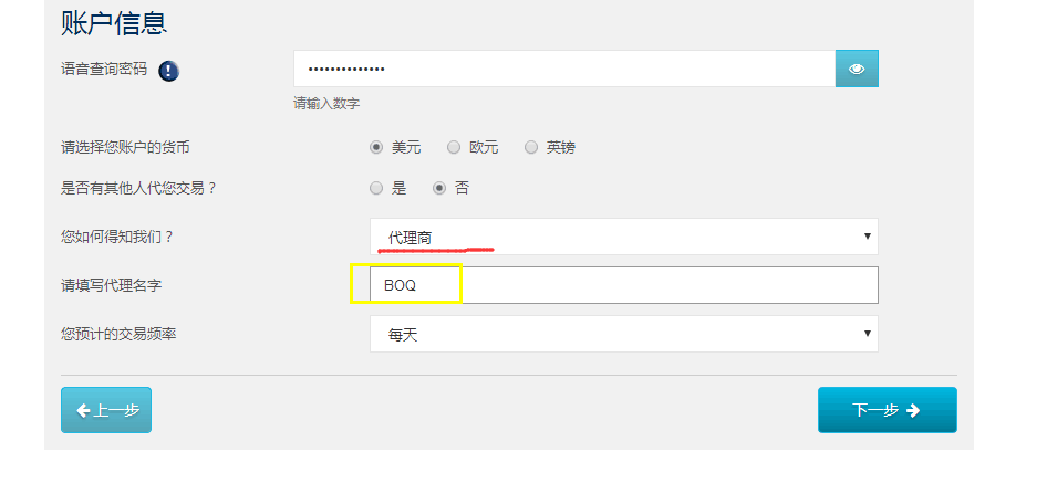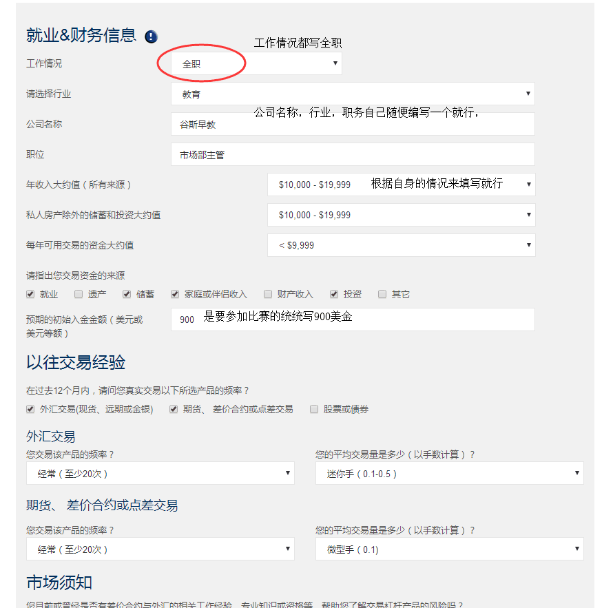 第三步、填写联系方式。选择“是”。如果选“否”会弹出地址栏让填写邮寄能寄到的地址。 第四步、个人工作,收入,资金情况。工作要填写全职,公司名称、行业、职务要填写完整,可以自己编一个。 注意:要参加比赛的,必须在预期初始入金金额那里,统统写900美金。