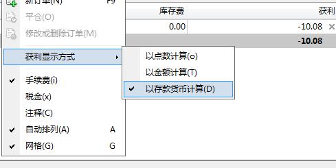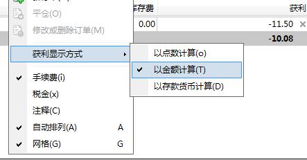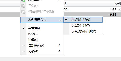 MT4上下方的订单栏里,最后的获利显示方式有三种;以点数计算、以金额计算、以存款方式计算。