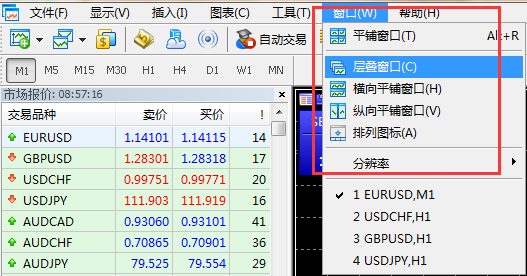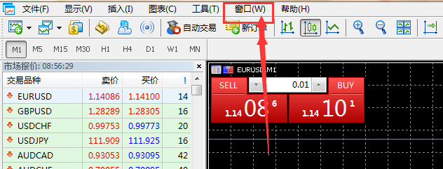 要想更改MT5上交易品种的图表窗口模式,首先在上方找到“窗口”,点击打开。