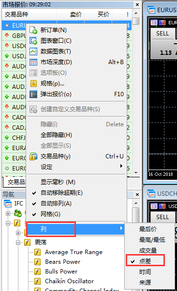 第一个、在市场报价那里点击有点把“点差”调出来,右键点击想查看的交易品种,在下方“列”里调出“点差”。