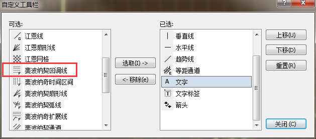 在左侧可找到斐波那契回调线,选择并添加到工具栏,就可以了调出了,
