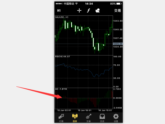 1、打开手机版MT4软件,然后在进入图表界面后,在图表中找到技术指标的符号按钮。