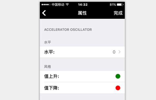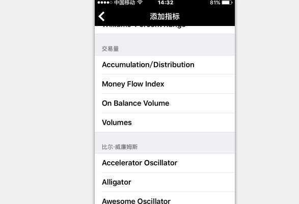 2、点击后可以进入技术指标的界面:一共有4大类指标:趋势、振荡器、交易量以及比尔.威廉姆斯指标,选择其中任意一个指标。