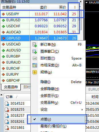 一、在左上角市场报价栏,右键点击,调出点差。"交易品种、卖价、买价"栏最右边出现“!”就是点差,底下对应的就是各个交易品种的点差了;
